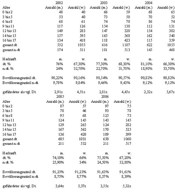 Bezüglich der nicht-deutschen Betroffenen ist zu beachten, dass dem statistischen Material keine Aufschlüsselungen nach Altersgruppen zu entnehmen waren, so dass sich die Aussagen somit allgemein auf die Altersgruppe von 0-18 Jahren erstrecken müssen, was dennoch aufschlussreich genug sein dürfte.