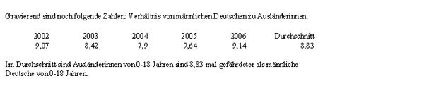 Im Verlauf der Untersuchungen wurden neben festzustellenden extrem signifikanten geschlechtsspezifischen Unterschieden bei den betroffenen Kindern und Jugendlichen ebenso extrem signifikante Unterschiede bezüglich deutscher und nicht-deutscher Betroffener deutlich, die alarmierende Schlüsse, sowohl was die Gleichstellung von Frauen in Deutschland als auch die Integration von Ausländerinnen und Ausländern in unsere Gesellschaft angeht, zulassen.