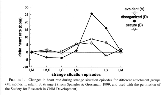 The "type D" pattern is found in over 80% of maltreated infants (Carlson et al., 1989). Indeed Spangler and Grossman (1999) demonstrate that this group of toddlers exhibits the highest heart rate activation and most intense alarm reaction in the strange situation procedure (see Figure 1). They also show higher cortisol levels than all other attachment classifications and are at greatest risk for impaired hypothalamo-pituitary-adrenocortical axis stress responding (Hertsgaard et al., 1995). Main and Solomon conclude that "these infants are experiencing low stress tolerance" (1986, p. 107). These authors contend that the disorganization and disorientation reflect the fact that the infant, instead of finding a haven of safety in the relationship, is alarmed by the parent. They note that because the infant inevitably seeks the parent when alarmed, any parental behavior that directly alarms an infant should place it in an irresolvable paradox in which it can neither approach, shift its attention, or flee. At the most basic level, these infants are unable to generate a coherent behavioral coping strategy to deal with this emotional challenge.
