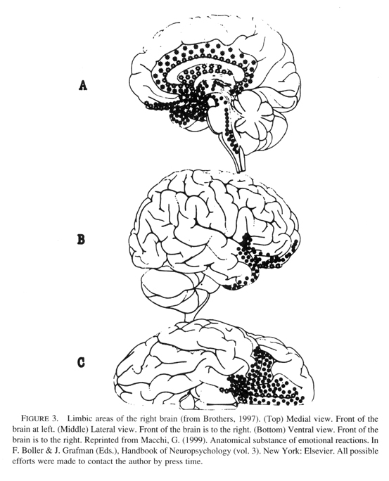 Of special importance are the connections between the orbitofrontal areas and the hypothalamus, the head ganglion of the ANS and control system of visceral-somatic emotional reactions, and the amygdala, the major fear center in the brain. The right amygdala is known to process frightening faces and to mediate the "nonconscious processing" (Whalen et al., 1998) of "unseen fear" (Morris, Ohman, & Dolan, 1999), but when adequately functioning the right frontotemporal cortex exerts inhibitory control over intense emotional arousal (Kinsbourne and Bemporad, 1984). According to Rolls "although the amygdala is concerned with some of the same functions as the orbitofrontal cortex, and receives similar inputs, there is evidence that it may function less effectively in...very rapid learning" (1996, p. 1443). In optimal contexts the orbitofrontal cortex takes over amygdala functions.