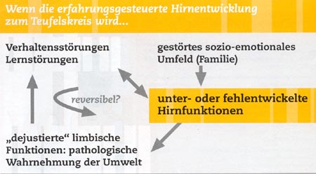 Die Kind-Eltern-Interaktion wirkt sich also auf die funktionelle Reifung dieser für spätere Lern- und Verhaltensleistungen essentiellen Hirnschaltkreise aus. Findet diese Interaktion in einer adäquaten Art und Weise statt, entstehen normal funktionierende limbische Funktionen und es kommt zu einer normalen emotionalen und intellektuellen Reifung. Im pathologischen Falle, beispielsweise wenn die Eltern-Kind-Interaktion zeitweise oder auf Dauer unterbrochen wird – und das können wir im Labor bei unseren Tieren unter sehr kontrollierten Bedingungen induzieren – kommt es ebenfalls zu einer Reorganisation dieser Hirnschaltkreise, aber vermutlich in eine andere Richtung. Wir vermuten, dass es in solchen Fällen entweder zu einer unvollständigen Reifung der limbischen Schaltkreise kommt oder sogar zu "defekten" synaptischen Verschaltungsmustern, die dann letztendlich vielleicht den seelischen und kognitiven Störungen zugrunde liegen, die in der Kinderpsychiatrie oder auch in der Erwachsenenpsychiatrie diagnostiziert werden.