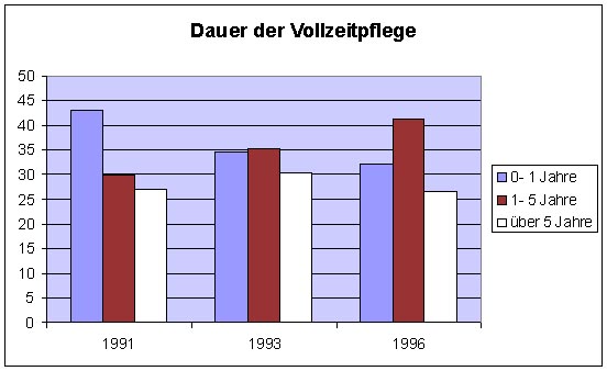 Faktisch entstehen vermehrt Pflegeverhältnisse mit einer Dauer von 1-5 Jahren, also jenseits von Kurz- und Dauerpflege (vgl. Janze, 1998). In ihrer Bindungsentwicklung beeinträchtigte Kinder über derart lange Zeiträume in der Schwebe zu halten, ist aus entwicklungspsychologischer Sicht nicht zu vertreten.
