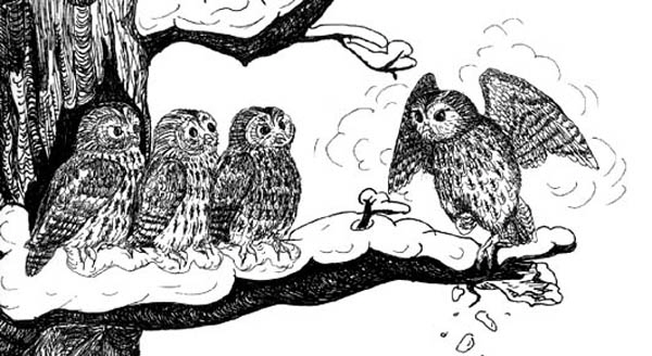 Es war höchste Zeit, denn nun kam der Winter mit Schnee und Eis. Er saß mit den anderen Käuzen auf einem kahlen Ast und fror jämmerlich. Als nach drei Wochen der Winter immer noch nicht zu Ende war, erklärte er feierlich: „Ich habe es satt, ich werde den Winter abschaffen!“