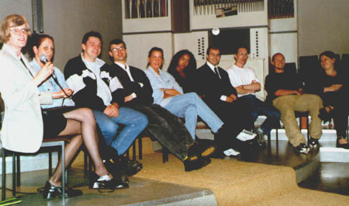 Von links nach rechts: Gudrun Eberhard, Projektleiterin; Michaela L., 27 Jahre, vom 9. bis zum 24. Lebensjahr im IPP, Hauswirtschaftshelferin; Detlef H., 30 Jahre, vom 10. bis zum 20. Lebensjahr im IPP, ungelernter Arbeiter; Arne-Dieter E., 23 Jahre, vom 6. bis zum 24. Lebensjahr im IPP, Gartenfachverkäufer; Tanja R., 27 Jahre, vom 8. bis zum 23. Lebensjahr im IPP, Erzieherin; Tatjana P., 17 Jahre, seit dem 5. Lebensjahr mit Unterbrechung im IPP, Gymnasiastin; Martin A., 24 Jahre, vom 9. bis zum 22. Lebensjahr im IPP, Ausbildung zum Bürokaufmann; Michael G., 24 Jahre, vom 9. bis zum 22. Lebensjahr im IPP, Maler; Nick G ., 17 Jahre, seit dem 13. Lebensjahr im IPP, Gymnasiast; Isabel B., 23 Jahre, vom 13. bis zum 23. Lebensjahr im IPP, Eurosekretärin. |