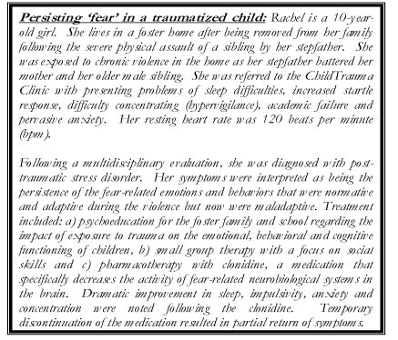Vorbemerkung: Die folgende Einzelfallstudie stammt aus dem Forschungs- und Behandlungs-Institut ( ChildTrauma Academy) von Bruce Perry. Ein psychisch schwer traumatisiertes Kind erhielt eine Gruppentherapie kombiniert mit Clonidine-Behandlung (hiesiger Markenname: Catapresan). Die Pflegeeltern wurden begleitend beraten. Es traten sehr eindrucksvolle Besserungen ein und deutliche Rückfälle nach zwischenzeitlicher Absetzung des Medikaments. Dürfen wir hoffen?