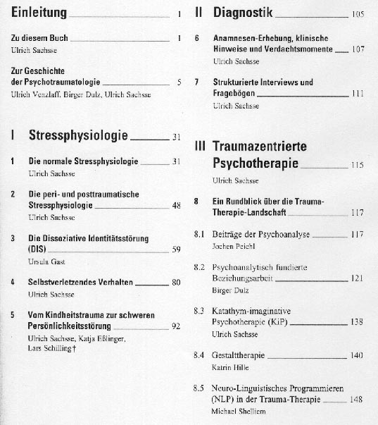 Der hier schon einmal rezensierte und mit einem einschlägigen Aufsatz vetretene Prof. Dr. Ulrich Sachsse, Leiter des Bereichs Psychotherapie im Niedersächsischen Landeskrankenhaus Göttingen, (s. Trauma, Trauma-Coping und Posttraumatische Belastungsstörung: Theorie und Therapeutische Ansätze; Körper, Seele, Trauma) legt ein umfangreiches Werk zur Psychotraumatologie mit dem Schwerpunkt auf 'Traumazentrierter Pschotherapie' vor. Er hat sich dabei der Mitarbeit von 21 KollegInnen versichert, die als ÄrztInnen, PsychologInnen und Fachkrankenschwester vielfältige Erfahrungen in der Therapie traumatisierter KlientInnen vorweisen können. Für mehr als 2/3 der Texte ist allerdings der Herausgeber selbst zuständig. Das Fachbuch ist unter eine durchgehende Systematik gestellt und mit einem ausführlichen Inhaltsverzeichnis versehen: