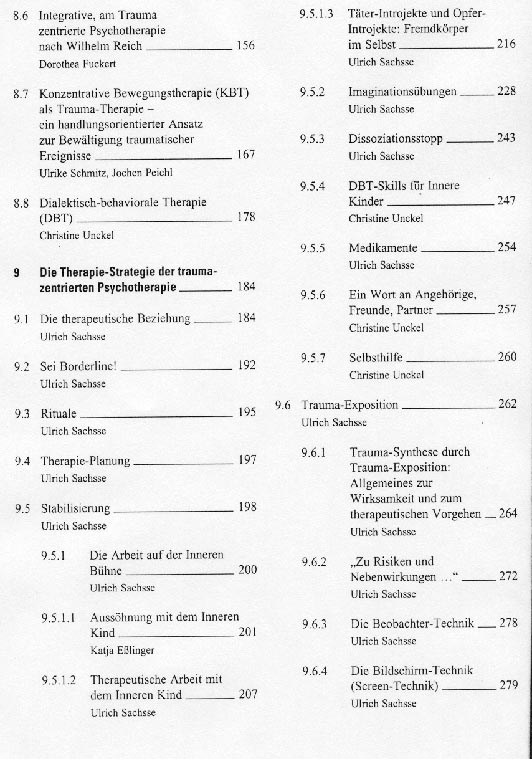 Im 9. Kapitel wird dann auf 127 Seiten von Sachsse und drei für einige Unterkapitel zuständigen AutorInnen der gegenwärtige Stand der 'Traumazentrierten Psychotherapie' dargelegt, wie er auf der Station 9 des Niedersächsischen Landeskrankenhauses in Göttingen unter wesentlicher Berücksichtigung der von Luise Reddemann in Bielefeld entwickelten Vorgehensweisen erarbeitet wurde. Dabei ist Sachsses Bemühen sehr ausgeprägt, die Quellen und historisch früheren AutorInnen von Vorgehensweisen, die auch in Göttingen angewendet werden, deutlich zu machen.